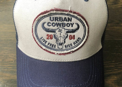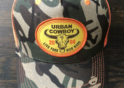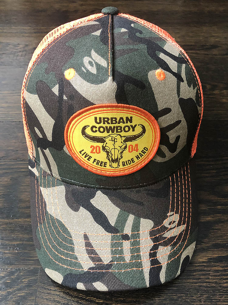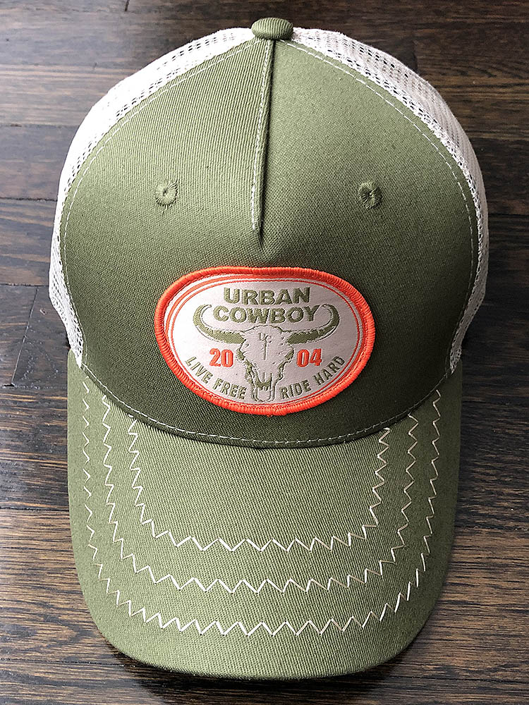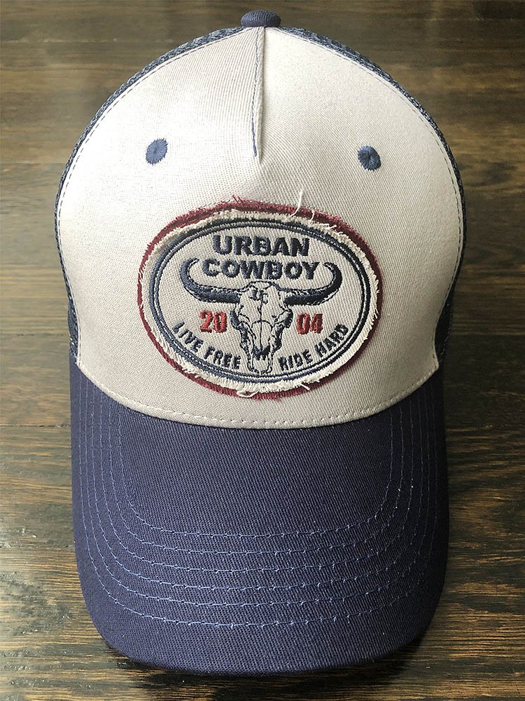 This trucker hat is designed with two different fabrics. The front section is cotton twill that features a curved visor with an Urban Cowboy graphic patch stitched on the panels. At the back side, mesh that create ventilation. With adjustable SnapBack and the bull skull tag adding a little detail that one can appreciate.