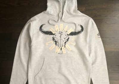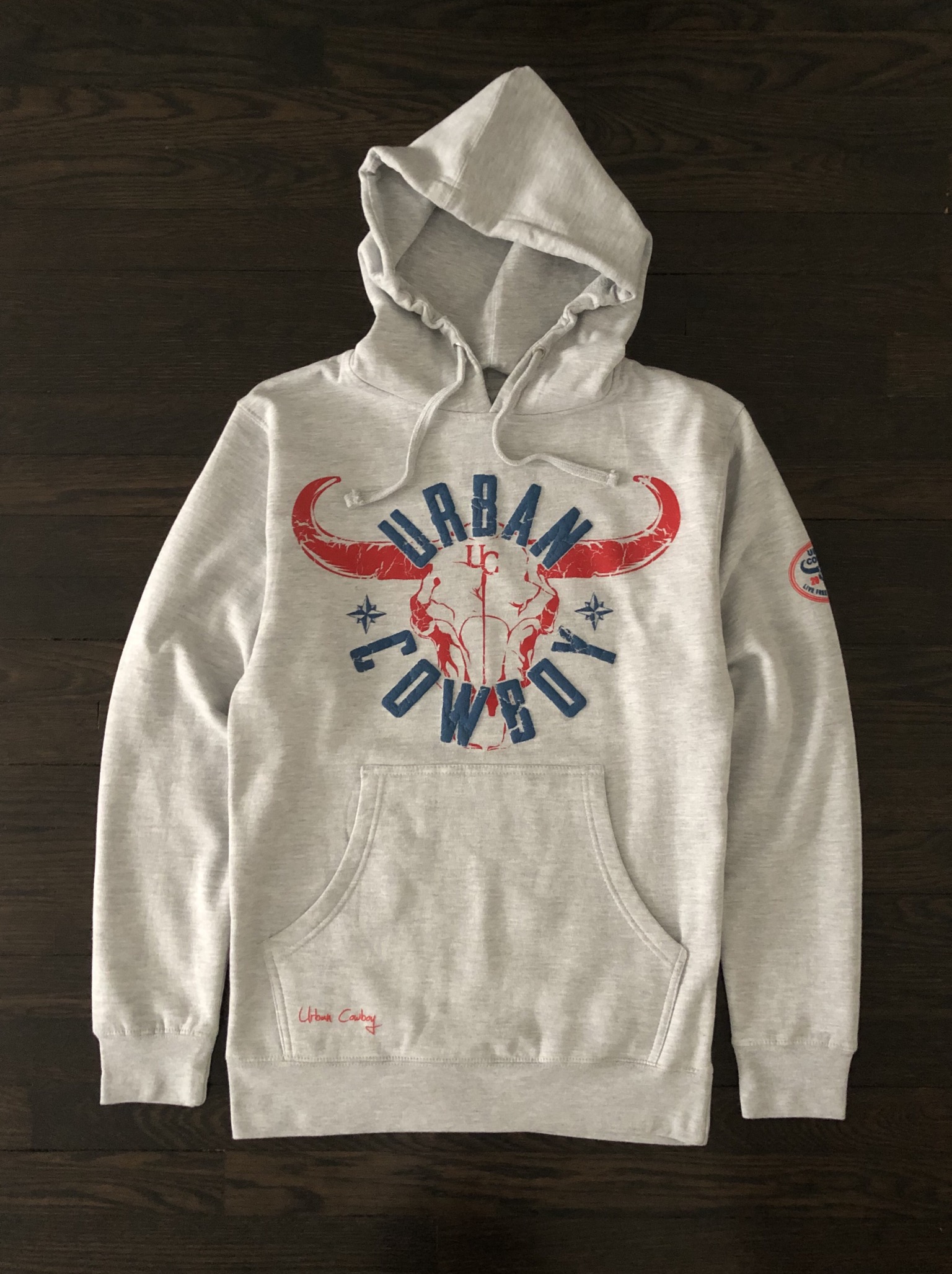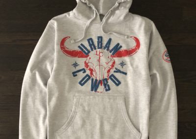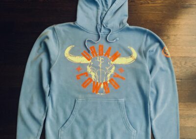 This Soft Premium Basic Urban Cowboy hoody features a split kangaroo pocket and a hood with a drawstring. The front shows a baby blue Urban Cowboy and a gray Bull Skull print.