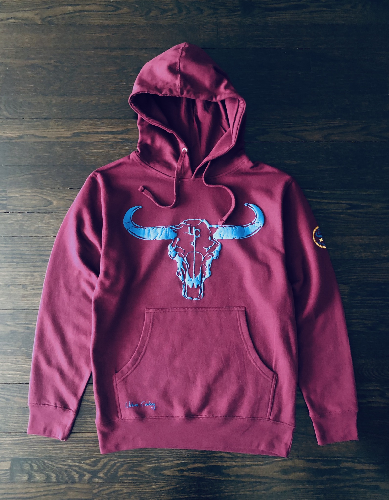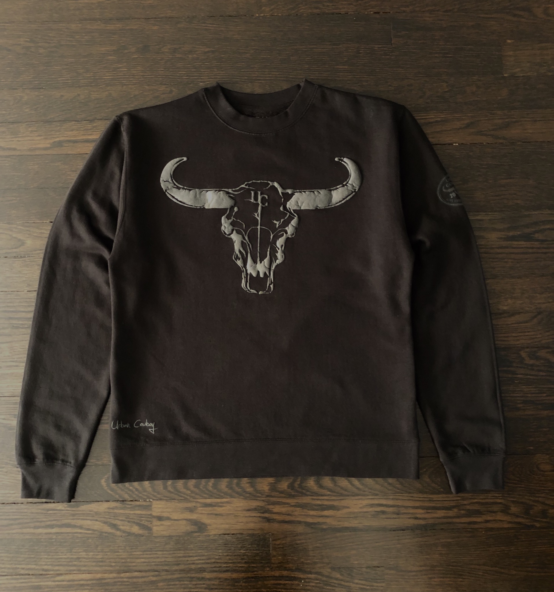 This Premium Basic Crew Neck Sweatshirt features a raised Urban Cowboy Bull Skull print on the front chest. Long sleeves showing a UC EST. print on the left sleeve with ribbed cuffs. Finished with a subtle Urban Cowboy signature at the bottom right near the waist band.